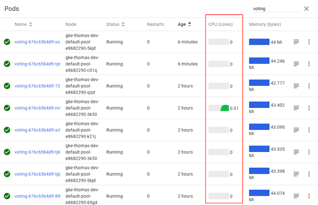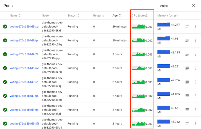 While the voting service displayed here has several pods, it's clear from Kubernetes's CPU graphs that only one of the pods is actually doing any work—because only one of the pods is receiving any traffic. Why?